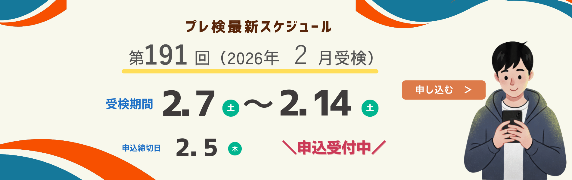 | 第191回 | 準3級 選択式(4択) | 2026年2月07日~2026年2月14日 申込(支払)締切 2026年2月05日 |