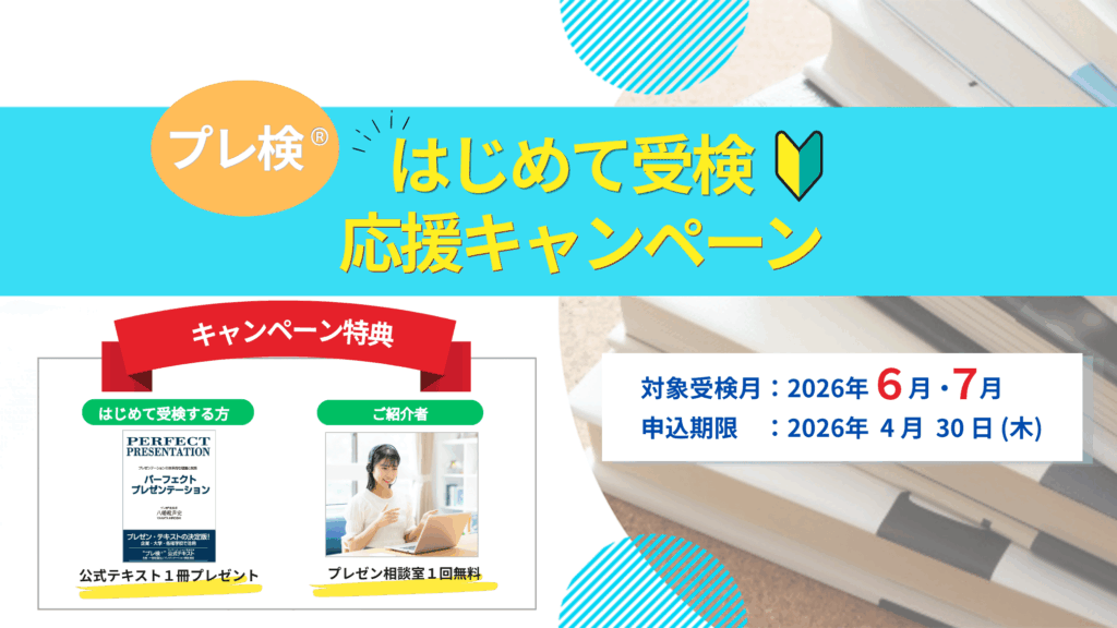 受検申込後、検定料の入金が確認できた方に、公式テキスト「パーフェクト・プレゼンテーション」1冊を無料でお届けします。