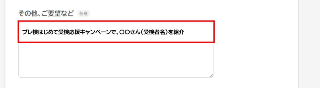 その他、ご要望などへ「プレ検はじめて受検応援キャンペーンで、〇〇さん(受検者名)を紹介」と記入してください。