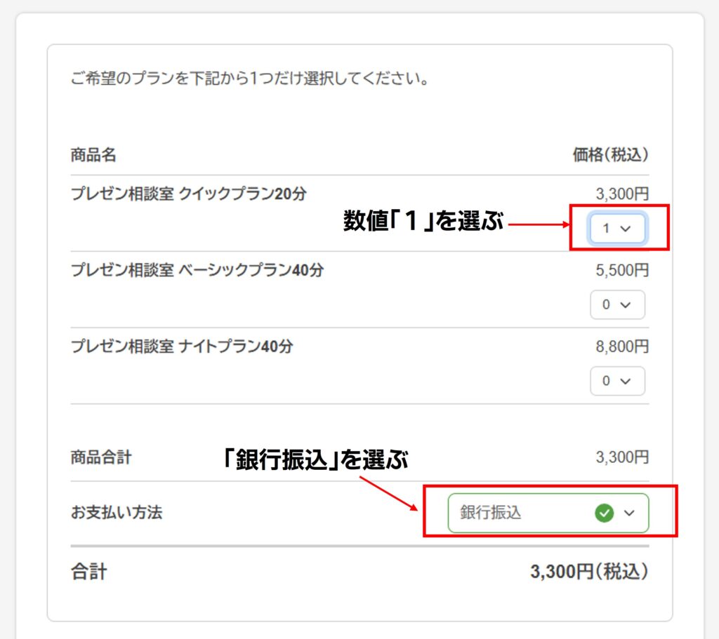 プレゼン相談室の申込フォームから「プレゼン相談室クイックプラン20分」の数値「1」を選んでください。