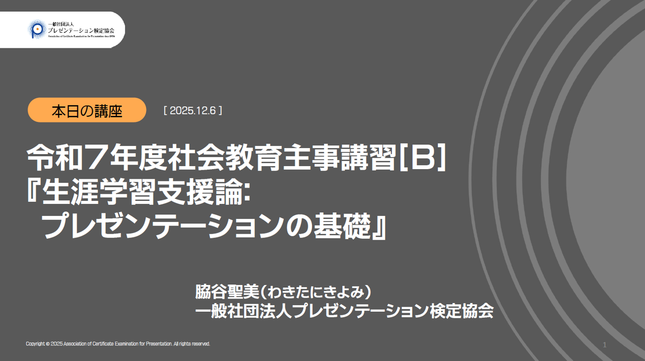 2025年12月6日(土)オンラインで、令和7年度社会教育主事講習[B]『生涯学習支援論:プレゼンテーションの基礎』を実施しました。対話型講義とミニ・ワークを組み合わせ進行しました。人に伝え、伝わるためのプレゼンテーションの基本を学び、自身の課題に気づくことを目的としました。演習では、学んだ構造をもとに話を組み立て、グループ内で実際に伝える実践を行い、相互フィードバックを通じて理解を深めました。オンラインでありながら双方向性を重視し、受講者が主体的に参加できる講義となりました。